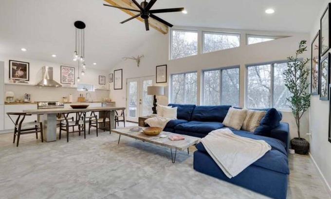 The main living area combines a full kitchen, large dining table, in a spacious open-floor design. Glimmering natural light from the numerous large windows dances across every surface, inviting you to sit back and relax.