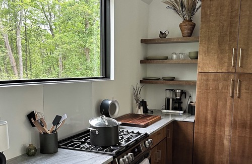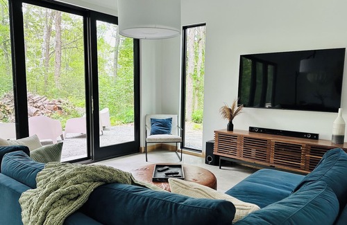 This modern Scandinavian barnhouse designed home features two bedrooms, one bathroom with shower, and a large open concept living, dining and kitchen space. Spacious and light, with soaring doors and windows, we wanted to let the outdoors in while creating a quiet, modern and well-appointed getaway.