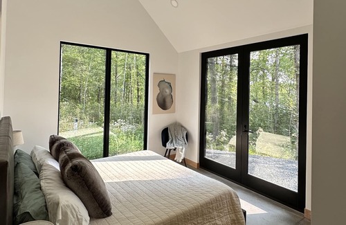 The primary bedroom with king bed walks out onto the lakeside patio with large windows to take in the beauty of the hardwood forest. For guests who need a quiet work space, the secondary bedroom with queen size bed features a private work space.