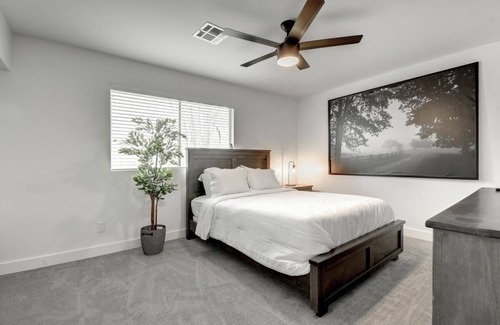 Indulge in a modern retreat at our 3 bed/2 bath home located just minutes away from Old Town. Enjoy ping-pong, a dart board, and flat screen TV's throughout - perfect for families or groups. Relax in the sleek living room, cook in the fully equipped kitchen, and rest in the comfortable bedrooms. The game room provides hours of entertainment. After a fun-filled day in Scottsdale, unwind on the patio with a glass of wine and enjoy the beautiful Arizona weather! TPT License #: 21442818 Upon entering, you'll be greeted by a spacious open kitchen, fully stocked with everything you'll need during your trip. The living room features a comfortable reclining couch and a 65" TV. The dining area can seat up to 6 people. Have fun in the game room, complete with ping pong and darts. The master bedroom features a connected bathroom, while guest room #1 is furnished with 2 twin beds and guest room #2 boasts a queen bed and a 65" TV. Other amenities include a washer and dryer and a fully fenced backyard. Entire Space can be used by the guests If you need any assistance during your stay at our vacation home in stunning Scottsdale, Arizona, our dedicated team member Cam is here to assist you with any questions, requests, concerns, or maintenance issues you may have. Quiet Scottsdale Neighborhood. Close to shopping, dining, and entertainment. The driveway fits up to 4 cars and there is also plenty of parking on the street.