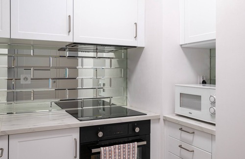 Modern Space Glamour Studio features a well-equipped and stylishly furnished room with a comfortable king-size bed, a kitchenette, a bathroom, and a cozy balcony where guests can relax and enjoy their morning coffee or an evening glass of wine. It offers a range of top-notch amenities, including free Wi-Fi, cable TV, a washing machine, an iron, a hairdryer, a dishwasher, an oven, a microwave, a fridge with a freezer, and kitchen accessories. The apartment is air-conditioned, providing extraordinary comfort, especially on hot days.