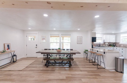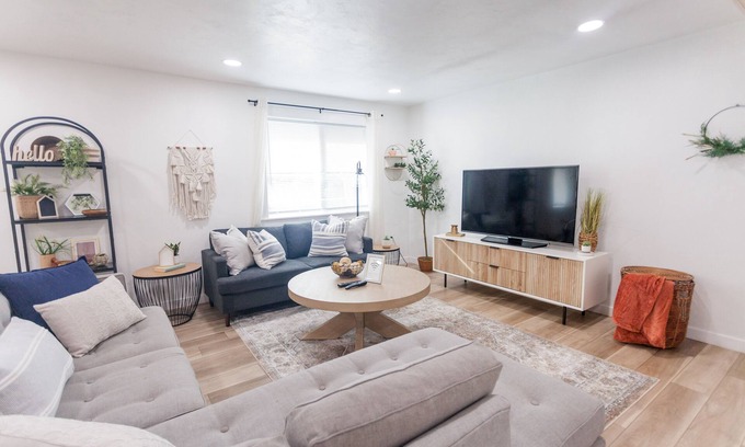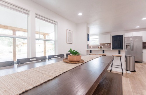 This newly remodeled modern ranch style home is perfect for your next stay. Home has 4 bedrooms and 2 bathrooms and a great large living room area. This 2300 sq ft home is great for large families or groups! There’s a small grass yard space in front and a front porch area with seating.