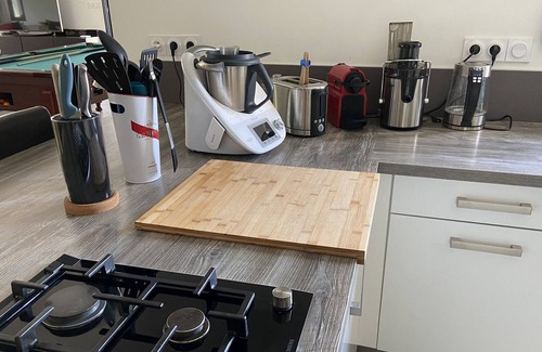 In the shade, the summer kitchen with gas barbecue and a plancha.