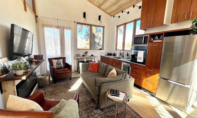 Welcome to the Railroad Retreat—a brand new, thoughtfully designed 660 sq ft jumbo tiny home offering style, comfort, and character. Located just a 5-minute (0.3 mile) walk to downtown Paonia and nestled by the historic coal train line, this upscale retreat offers mesa views, curated interiors, and a truly unique stay for solo travelers and couples. Property Overview