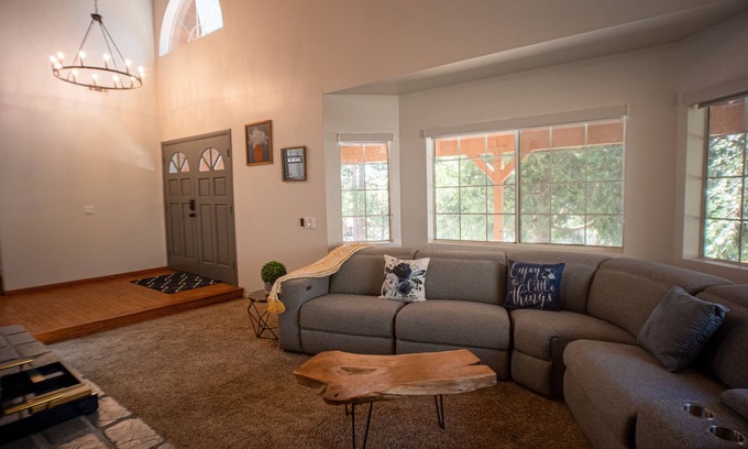 Cozy modern cabin is perfect for group & family trips. Spacious 3 bedrooms + 2.5 bathrooms w garage, electric charger (EV), 2 fire places, living room, family room w wet bar. Outside area w hot tub, bbq grill, picnic table, & deck w furniture + fire pit overlooking nature. Walking distance to village market + LuluBelle Bakery, 5 mins Arrowbear Lake, 9 mins- SkyPark, Snow Valley Mountain Resort, Snowdrift Snow Tubing, 15 mins Lake Arrowhead or Green Valley Lake, & 30 mins Big Bear, + much more!