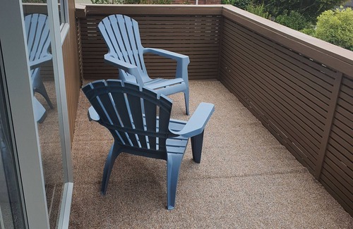 Bedroom two has a generous queen bed, plenty space with doors opening onto a relaxing balcony with a table and seats to read or relax.