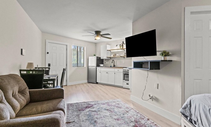 Bright, modern, and thoughtfully designed—this stylish studio apartment is just steps from Merrimack Park. The open-concept layout offers a spacious feel, complete with a fully equipped kitchen featuring butcher block countertops and all the essentials. Unwind on the plush King-sized bed or relax in the cozy lounge area. Stay connected with high-speed Wi-Fi and a dedicated workstation. Enjoy your morning coffee in the shared garden courtyard—perfect for a peaceful start to the day. Book now!
