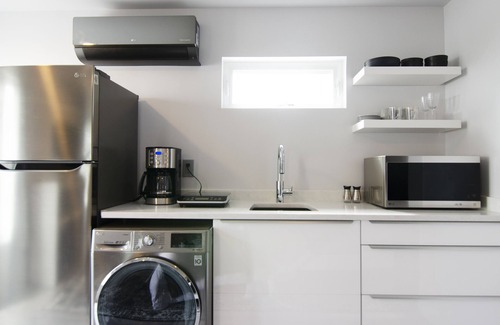 New Kitchen with Quartz countertops & LG W/D. Casper Queen Bed with fresh linens. Spa-like bathroom with Illuminated mirror & Raincan shower. New Paver Patio just for your use! Sip your wine or favorite cocktail outside. The apartment faces east, offering plenty of morning sunlight, and features blackout curtains for added privacy and darkness, ideal for day-sleeping guests.