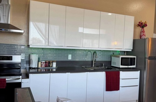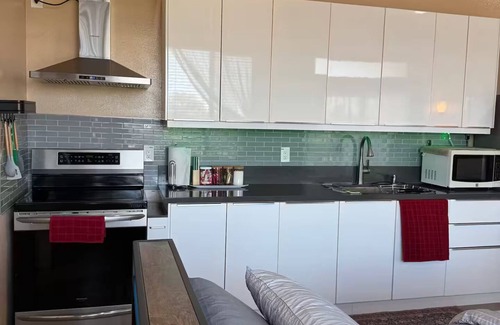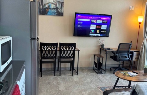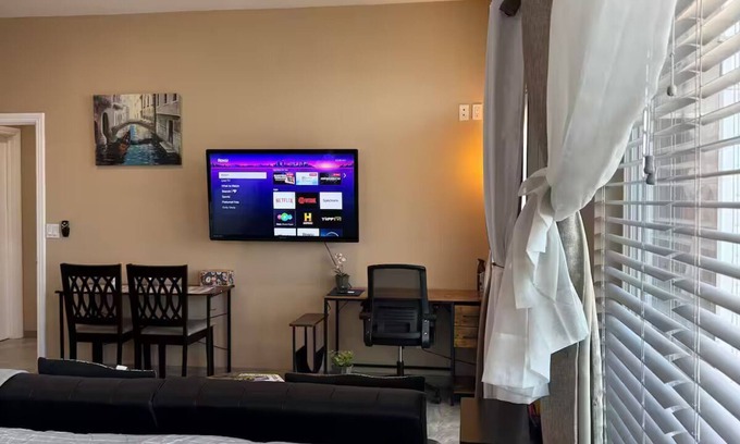 Welcome to our modern Riverside studio, where you can enjoy a comfortable and stylish getaway with your family: two guests. This cozy retreat is equipped with a king bed (brand new bed and mattress installed July 4, 2025), a TV, a futon sofa, a fully equipped kitchenette, a full bathroom, and a balcony with a breathtaking sunrise city view.