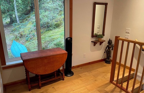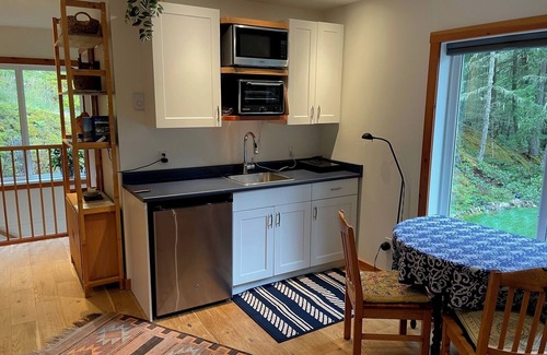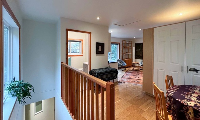 Stylish studio suite above a garage with large windows, hardwood floors, equipped kitchenette, and full bathroom in a treed rural setting on a beautiful island in the Salish Sea. Experience the silence of a forested retreat.