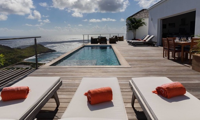 Beachside greys and speckled pool tiles mimic the colors of the rocky point of the island at Villa La Vue, St. Bart’s, so that guests here can be on the beach in the comfort of a cliffside villa. With minimalist decor off the pool terrace, plenty of seating, and a birds-eye vantage point, views off the point at La Vue are stunning and unbroken. Come to Villa La Vue for the views and stay for the comforts.
