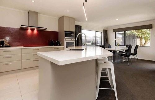 At the hub of this fantastic holiday home lies a large functional social kitchen with a large island and walk-in scullery. Relaxation begins here, with easy indoor-outdoor flow leading to the covered red outdoor entertaining area, making it the perfect space for entertaining regardless of the weather. A private garden sets the scene for indoor-outdoor entertaining, while expansive open-plan living areas can be adjusted to create a more intimate space depending on your mood.