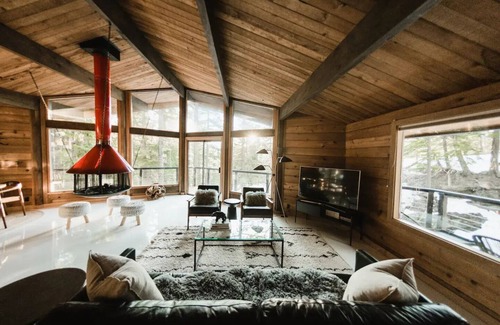 Stay in a one-of-a-kind mid century modern treehouse cabin, high up in the trees. Everyone in the area knows the house on stilts.