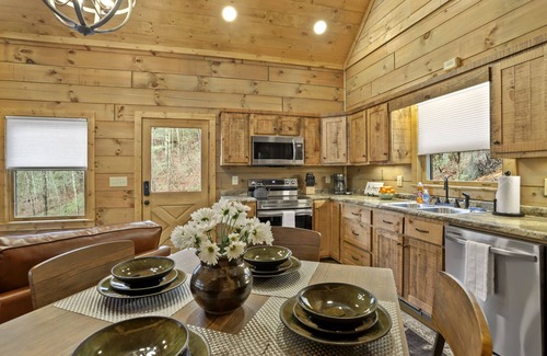 Inside the front door is a Samsung stainless steel kitchen with a full size refrigerator and a six seat high top dining table. High end Pottery Barn dishware is provided, along with Calphalon pots, pans and a lobster pot for your low country boil in the mountains.
