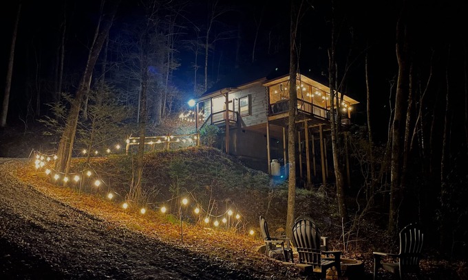 Halfway down the driveway is a stone fire pit with Adirondack chair seating and string lights to guide your way on the star filled nights in Cherry Log.