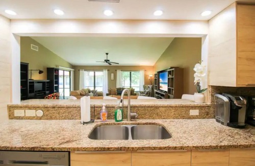 The Villa has a split plan with 1350 sq. ft. of living space. The living room is huge with a brand new super comfortable sectional sofa, a giant 65” smart tv with cable and Netflix to watch movies. The new kitchen has everything you need including a coffee bar with Nespresso, Keurig and Mr. Coffee machines, Electric Kettle. There is coffee, pods, sugar and cream packets to get you started. There is even a popcorn and panini maker. The 2 bedrooms also have tv's with cable with a smart tv’s. They have black out curtains for sleeping in. The large main bedroom has a comfortable king bed with supportive firm comfy mattress and reading chair next to the sliding glass doors that lead out to the lanai. The guest bedroom has a brand new comfortable queen sized bed with firm memory foam mattress. There’s space in this room to place the available extra full size mattress (available in the closet for use) complete with pillows and linens if you have children that want separate beds. There is also a super clean full size sleeper sofa in the living room. There is a large desk with an wireless air HP 6400 printer/scanner along with paper and ink to get things done while you are away. The central air conditioner is brand new to keep you nice and cool. The tranquil Lanai is the perfect place to enjoy a cup of coffee or an afternoon drink while watching the wildlife around the area. We have cranes, bunnies, squirrels, cardinals, hawks, eagles and more. The kitchen has an eat-in dining table with 4 chairs but you can fit 2 more chairs available around the Villa. Plus there are 4 stools at the kitchen bar. There is full size washer and dryer closet in the Villa for your convenience.