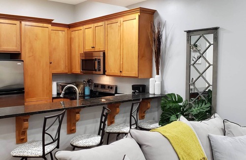 Sometimes you're out all day looking at the beauty of the city and need to chill. We've got you covered! We're steps from a full-size grocery store, Forsyth Farmers Market, or Brighter Days Natural Foods. These options provide the best options for an amazing night in of cooking in our fully equipped kitchen. The black granite countertops, Stainless steel appliances, and open kitchen make it fun to cook and converse with your friends and family while feeling like you're at home. Our breakfast bar provides seating for four and there's an additional table with seating if you'd rather have dinner at the table.
