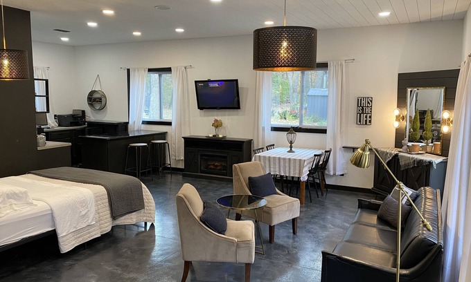 When you spot the lit, rocked pillars from the road, You'll turn into the gravel driveway and head down the oak covered drive. Pulling up to your concrete parking pad, just steps from your private front door, you'll enter Modern Willow Studio. A spacious 680sq. ft. studio set with open concept living room, dining, kitchen, 2-4 person sleeping and beautiful 3/4 bath. Modern Willow is set with large windows on each wall, all facing the beautiful oak woods. With the spacious area to spread out, you'll feel cozy with the electric fireplace at the foot of your comfortable queen bed. A great place to escape the city or relax after a hike on various trails in Morrison County.
