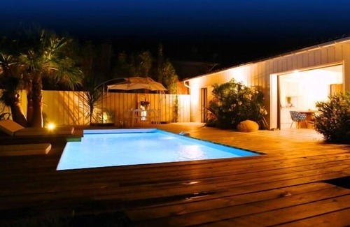 We have renovated this wooden villa with all the comforts to come year round, it is as pleasant outside with its heated swimming pool as inside with its cozy spirit and fireplace. Ideally located in a quiet area between the basin and the ocean, all accessible by bike, market, lighthouse, restaurant. the total change of scenery as much in half season as in summer. The villa consists of a main part with living room, kitchen, fireplace lounge, two bedrooms, two shower rooms, a large independent outbuilding with 3 comfortable bedrooms and two bathrooms. water.