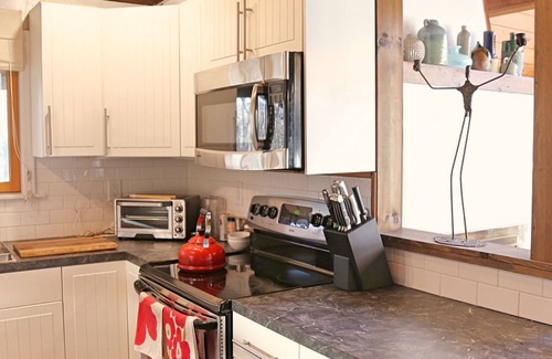 Main Floor: The main floor includes a master bedroom, bathroom, kitchen, living room, and dining area. The master bedroom has a wall-to-wall closet, a queen sized bed, and a large window with beautiful sunrises. The bathroom has a shower/bathtub and a large vanity. Towels, toilet paper and soaps are provided. The fully modernized kitchen has stainless steel appliances and all that you need to prepare meals (pots, pans, utensils, dishes, blender, Dutch over, cast iron skillet and more). For coffee lovers, choose from an auto-drip coffee maker, French press, or pour over, and we have both electric and hand-crank grinders. Bring your own coffee beans or sample ours. For wine enthusiasts, there is a wine fridge and rack. The kitchen also features a long counter with stool seating. The living room has floor to ceiling windows with seasonal mountain views in winter and beautiful woods in summer. Unwind on the leather sofa or in our large wingback chair, or cozy up to the fire on our brick hearth. The large wood dining table can seat up to 10 comfortably with extensions. We have a smart TV with streaming channels (HBO, Netflix, Amazon Prime, Disney +, and more). You can access the deck from the living room via a sliding glass door.