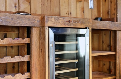 Lower Floor: The lower floor is a fully finished basement with natural wood paneling throughout, a bedroom, bathroom, and sitting area. The bedroom has a queen size bed, dresser, and bench. The recently renovated bathroom includes a large soaking tub with hand-held shower attachment, and glass bowl sink. The lower floor also has its own entrance, providing easy access to the driveway, fire pit, and the rest of the property. Please note that the basement tends to be 5 degrees cooler than the rest of the house. There is a separate heater in the bedroom that provides additional warmth in winter.