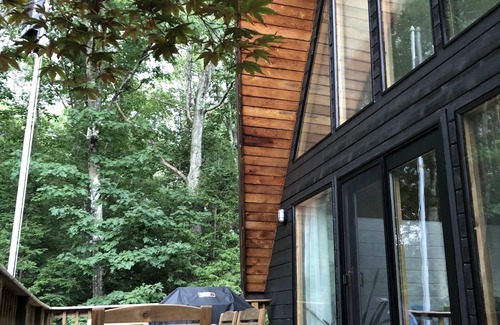 The Property: As you come up the long driveway you'll know you have arrived. The Chalet is a classic A-frame house, with high ceilings, big windows and tons of natural wood finishes. The house sits on more than an acre of land, with ample parking, a yard surrounding the house, and adjacent wooded areas. Access the front door up a flight of stairs or use the separate ground-level entrance. There is a large covered porch and our wrap-around deck is ideal for star-gazing or taking in the natural surroundings.