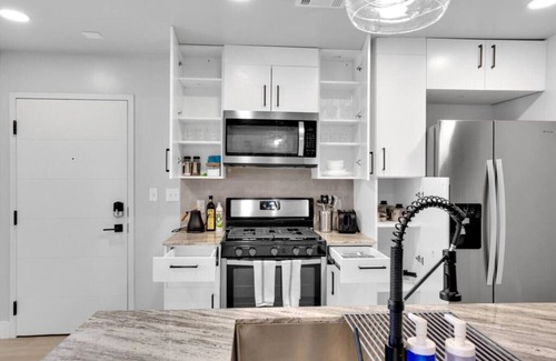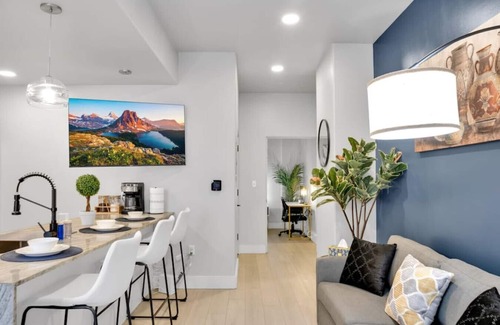Unwind in this stylish one-bedroom apartment located in the heart of Tulsa, offering comfort and convenience for up to four guests. This inviting space features a spacious living room with a 55-inch flat-screen TV, a dedicated workstation, and an open floor plan that ensures a bright and airy atmosphere. The bedroom is your private oasis, complete with a plush queen-sized bed and a second TV for your entertainment. Whether you're visiting for business or leisure, this modern apartment provides the perfect environment for relaxation and rejuvenation.