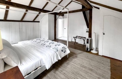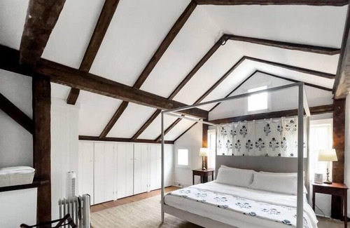 The warmth and Exposed Beams wood ceiling exemplify the charm country home. This house is in the most historic and architecturally eclectic neighborhood in west Cornwall it has a stunning wooden chandelier and 2 antique fireplaces.