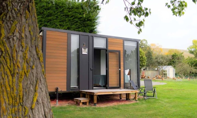 A cozy 139-square-foot tiny home is just an hour's drive away from Christchurch. It has easy access to water, split air conditioning, a kitchenette, cooking equipment, and excellent bathroom facilities. These amenities include an eco-friendly cassette toilet with a removable waste holding tank, a hand basin, and a gas-heated shower for your use.