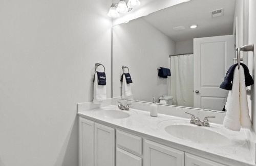 When you exit the master bedroom, you’ll find a shared hallway bathroom. The bathroom has a tub/shower combination, single vanity, and toilet.