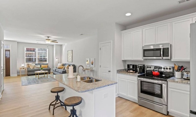 Immediately off of the living room area, you will find yourself in the dining/kitchen area. Sit down for a meal on our 4-seater dining table, or enjoy bar-seating at the granite island. Want to cook for your friends and family? No problem. The kitchen is fully stocked with pots, pans, dishes, glasses, spices, oil, salt, pepper, and much more to make cooking a breeze. As you walk around, you’ll find a section of the counter top fully equipped with a coffee station.