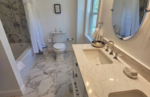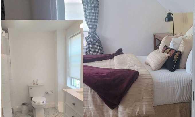 The Monhegan Suite is named after one of the nearby islands in Penobscot Bay where Rockport Harbor is located. This second Level Queen bedroom is accessed by the front entrance staircase. The room opens to skylights, luxury bedding, elegant decorations, romantic electric fireplace, flat screen smart TV, spacious walk in closet, and air conditioner unit. The connected en suite bathroom overlooks the courtyard gardens and has a double vanity and full bathtub/shower. Access to the lower level of the house is restricted (unless the whole house is reserved), but Monhegan Suite guests are welcome to use the firepit in the backyard. Access to adjacent lodge outdoor heated pool (open seasonally), and guest BBQ, firepit and gardens is also included plus free morning coffee in the lodge office. Entry is through Inn front door and parking is on grassy knoll alongside driveway. No smoking in or on this property. No dogs allowed in Monhegan Suite. Check in at Starlight Lodge Office. 2 night minimum/$50 cleaning fee.