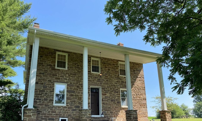 Located on 4 acres of scenic privacy just 12 miles from downtown Frederick and 1 hour drive from IAD, BWI and DCA. The historic 5 BR and 2.5 BA stone farmhouse was completely renovated in 2017 to accommodate 11 guests comfortably. The property offers beautiful vistas and sits a short walk to Creagerstown Park along the Monocacy River with canoe/kayak and fishing access. Enjoy the beautifully appointed interior of the home, sun room, or the views around a cozy campfire.