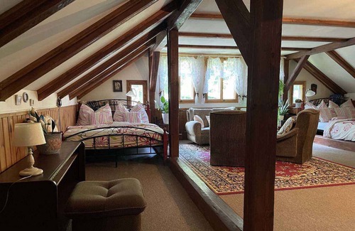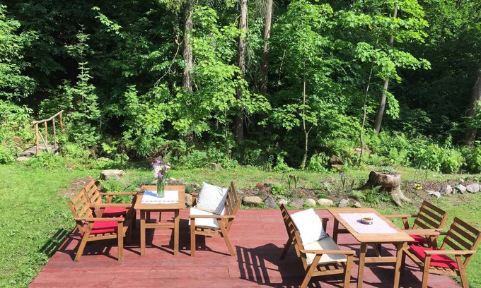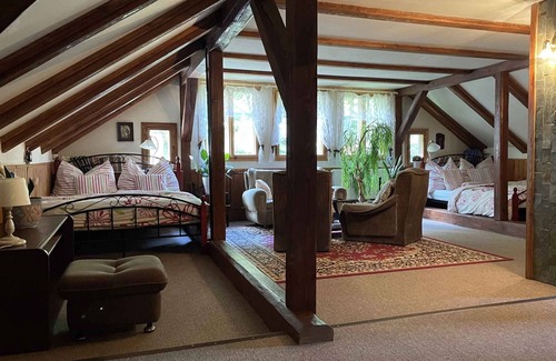 The standig individually montain hut, renovated in 2022 is rustic, functional and in the typical country style furnished. The property is located in a holiday home area, on the outskirts. The domicile is also popular because of the view over woods from the property and the quiet and sunny location at the edge of the woods and at the water. For exclusive use are available: sunbathing area, parasol, sun lounger, children's playground, swing, sandpit, climbing frame, grill possibility, garden furniture and fire place.LocationDesná v Jizerských horách, district Černá Říčka, 800 m above sea level. The montain hut is located on a 2100 sqm, open water plot with meadow, flowers and bushes. The landlord does not live in the house or on the property. Through the property flows a brook. A bridge leads to the forest. The natural swimming pool 20X30 m on the property, the water is clean, fresh soaking and bathing is amazing. In winter you can go ice skating. Typickým Jizera Mountains v přírodní rezervaci. The access goes directly from the main road (asphalted). Parking lot (for 5 cars) on the property. Specialcentral heating, electric heating. Facilities: internet access (WLAN), iron and washing machine. TV reception takes place via satellite. PoolNatural bathing possibility at the house Leisuredarts. Dogsallowed, EUR 20.00/pet per stay. DistancesShopping opportunity 4 km, restaurant 3 km, town center 3 km. railway station in Desna 3,5 km. indoor swimming pool, sauna each 10 km in Jablonec nad Nisou. discotheque in Smrzovka 9 km. Railway line 3,5 km.In summer: Badeteich 20x30 m 50 m in am Haus. golf, fishing, boat rental each 10 km in Jablonec nad Nisou. tennis, mini golf each 4 km in Tanvald. Outdoor pool in Tanvald 4 km.In the winter: Ski lift 600 m in Desna. Desna: trail 200 m and ski rental, ski school each 600 m. ice skating in Jablonec nad Nisou 10 km. sledge slope in Tanvald 4 km. DivisionMontain hut, 2 floors, 5 rooms (including 4 bed rooms), 250 sqm, in total 14 beds. Smoking is prohibited in the property. RoomThe entrance in your mountain hut is located on the ground floor and leads over 4 stages directly in the vestibule.Ground floor: Common room (50 sqm, walk-through room) with sitting area, TV, fireplace, radio, stereo system, video, record player, DVD, CD and dining area (15 seats). Kitchen in the eat-in kitchen (20 sqm, walk-through room) with dining area (2 seats), electric stove (ceramic hob, 4 plates), oven, fridge (icebox), microwave, coffee machine, toaster, electric kettle and washing machine. Bathroom (5 sqm) with bathtub with shower facility, washing machine, shower, 1 sink, WC, hairdryer and window. Bathroom (18 sqm) with bathtub with shower facility, shower, 1 sink, WC and window. Top floor: Bedroom (13 sqm) with 1 double bed and sitting area. Bedroom (40 sqm) with 2 double beds, 1 single bed, sitting area, TV and radio. Bedroom (15 sqm) with 1 double bed and sitting area. Bedroom (20 sqm) with 1 double bed, 1 single bed and sitting area. Terms of lease and pricesIncluded in the priceinternet access, parking place, water, final cleaning, bed linen, sunloungers. Side costs-Costs on the spot:/Obligatory:electricity 0,28 € per kilowatt hour based on usage. hand towels to bring along. local tax by local tariff.Deposit:EUR 200,-/object.