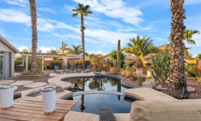 Discover an extraordinary backyard retreat designed for ultimate outdoor living. This breathtaking desert oasisfeatures a stunning pool with a hot tub, vibrant landscaping and towering palms. The expansive backyard boasts a chic pergola with a built-in grill for alfresco dining, plush lounge seating by a cozy firepit for stargazing, and a cornhole set for fun-filled afternoons. Every detail, from winding pathways to secluded nooks, is meticulously curated for both entertaining and relaxation.