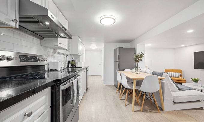 Descend into a relaxing beach-themed oasis at this basement retreat. Unwind in a room adorned with coastal decor, complete with a desk and chair for a serene workspace. The living room invites you to enjoy entertainment on a Smart TV. With laundry facilities on hand, your stay is both comfortable and convenient. The fully stocked kitchen adds to the allure, making it a perfect home away from home. Embrace the soothing ambiance of this well-appointed beach-themed basement.