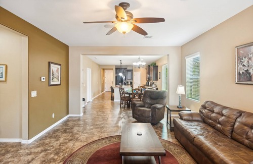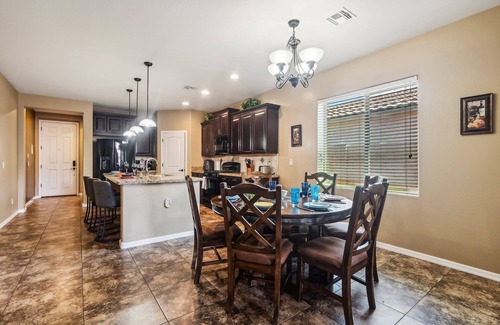 The living room has plush seating to kick your feet up and spend some time with the kids or cheer on your favorite sports team. There is a DVD player available if you've got some movies you've been waiting to see with friends. The sliding glass door leads you out to the backyard where you can see the beautiful Arizona sunsets. A BBQ grill and outdoor dining table are available for your use.