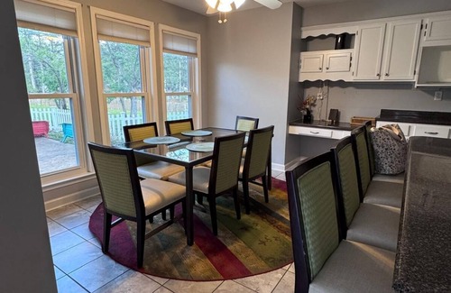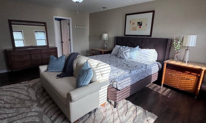 Enjoy the oversized backyard, ideal for group gatherings, with a charming gazebo that offers a serene, park-like feel. Inside, the home offers fast Wi-Fi, smart TVs, and a mix of 2 king beds, queen, and full-sized beds to ensure a restful night’s sleep.