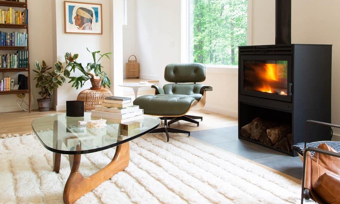 Master bedroom has king sized bed with Casper mattress, Eames lounge chair, large format windows and a luxurious oversized bathroom with a deep soak tub and separate shower. TV located in this room.