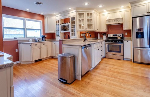 On the lower level, you'll find a full second Kitchen, Family Room area, Bedroom 4 and a Full bath. Bedroom 4 has a Queen bed with a full bath right next door to the bedroom. The bath includes a Tub/shower. In the Family room, there is a futon, TV, and a table for playing games. This house is the perfect spot for 2 families or couples to stay if you're wanting to spend time together, but have your own spaces. The upstairs and the lower level can both be self contained with separate outside entrances, and each having a kitchen, bedroom, and bathroom.
