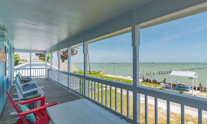 Located on historic Water Street in Rockport, Texas, Moon Mirror Bay is a beautifully designed, newly remodeled house with an amazing view of Aransas Bay. Get ready to experience stunning sunrises and fantastic sunsets right from the front deck of this completely refreshed 2-bedroom 2-bath home. You can even enjoy the view from the comfort of your bed or while having coffee in the brand new, fully equipped kitchen.