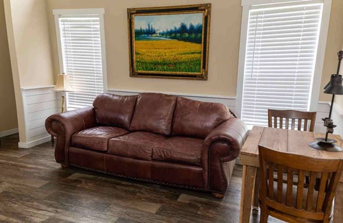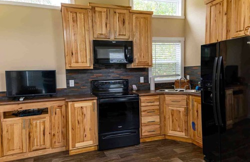 The Magnolia Cabin is a new stand-alone cabin complete with it's own porch and fire pit. The Cabin also features a living area and kitchen with refrigerator, stove/oven, coffee maker, microwave and all the dishes, sliver ware and utensils needed to cook, if you must. In a separate room is a luxurious full-sized bed and plenty of closets and storage space. Adjoining both the living area and bedroom is the bathroom complete with a glass enclosed shower. This cabin is so nice, you might want to stay in, but don't the Ranch and all it's splendor is right outside your door.