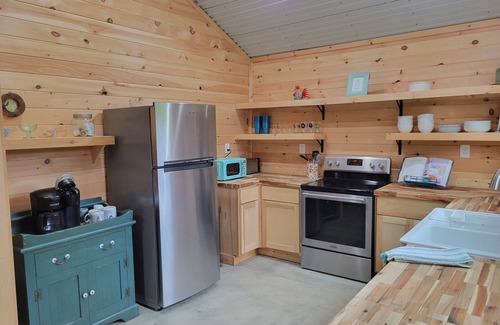 A beautiful cabin with 2 bedrooms both with king sized beds. 1 full bathroom inside and a half bath in the pavilion with a private outside shower. Comfortable living space with a fully stocked kitchen. Outdoor seating and a gas grill. A fire pit and firewood for sale on site. Starlink Wifi with excellent connectivity is available.