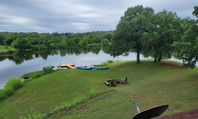 The water view is spectacular as you relax on a hillside overlooking a private 10 acre lake stocked with fish and fun! The cabin has its own fishing/swimming dock complete with pedal boat canoes, kayaks, and life jackets. Make memories around either fire pit -- front of house near the patio swing, or lakeside where you might see the neighborhood ducks paddle by! Two levels of outdoor deck space hold new outdoor seating, a new 4-burner propane grill, and new patio furniture. The shared area in the neighborhood includes a volleyball net and a basketball goal.