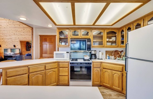 The kitchen has a stove, oven, microwave, fridge and freezer. The kitchen is fully equipped, just bring the food.spices,oils and you are set. There are serene views of the forest from every window.