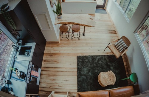 The main floor boasts a warm and inviting living room and a well-appointed artsy tiny kitchen. There is a loft above with a queen sized bed for sleeping and a cozy but still lavish bathroom with a sink, flush toilet and marble shower.