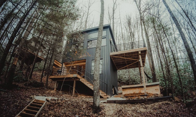 Moonshadow is a sleek and charming, two-story woodland cabin nestled amidst a picturesque hillside, offering a cozy and eclectic retreat. This idyllic cabin provides all the modern comforts and amenities of a larger home while maintaining the intimate appeal of a smaller space. This cabin is situated close to our very first authentic Canopy Crew Treehouse, "Sylvan Float." We highly recommend booking the two together for larger groups who have some folks who want to remain grounded and others who want to explore what it's like to live up in a tree!