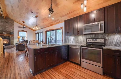 On the main level of the cabin, there is a bedroom with a king bed and attached full bathroom, an open concept kitchen, dining and living area as well as a half bath. The lower level has another living room with a full futon bed, two bedrooms (one with a king and the other with a queen) and a full bathroom. We provide plenty of bathing linens in both baths as well as some extras in the lower level king bedroom closet.