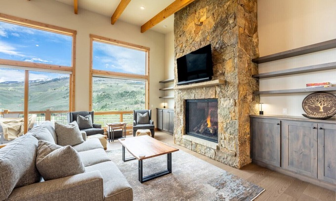 The main level offers a primary suite with a king-size bed, living area with floor-to-ceiling windows, a full-size kitchen, dining area and two private balconies. Whether you choose to unwind by the stacked stone fireplace, enjoy a family movie night, or simply relax with the sunset in the background, the options are endless. A powder room down the hall adds to the convenience. Additionally there is a private laundry area and mudroom.