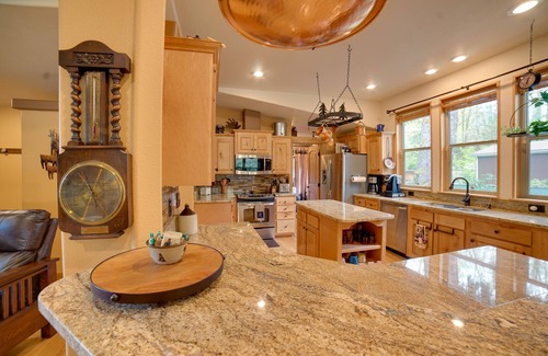 KITCHEN: Stainless steel appliances, glass-top electric range, microwave, dishwasher, fridge w/ ice maker, drip coffee maker, dishware & flatware, spices, island, granite countertops